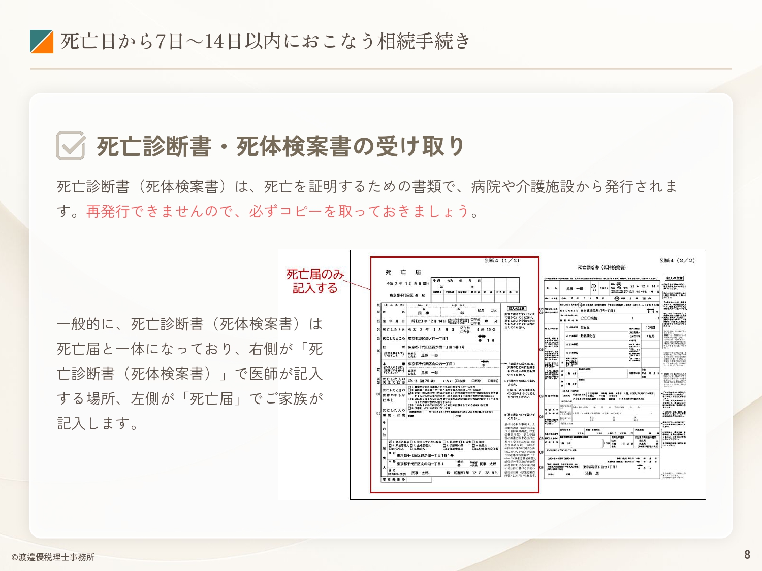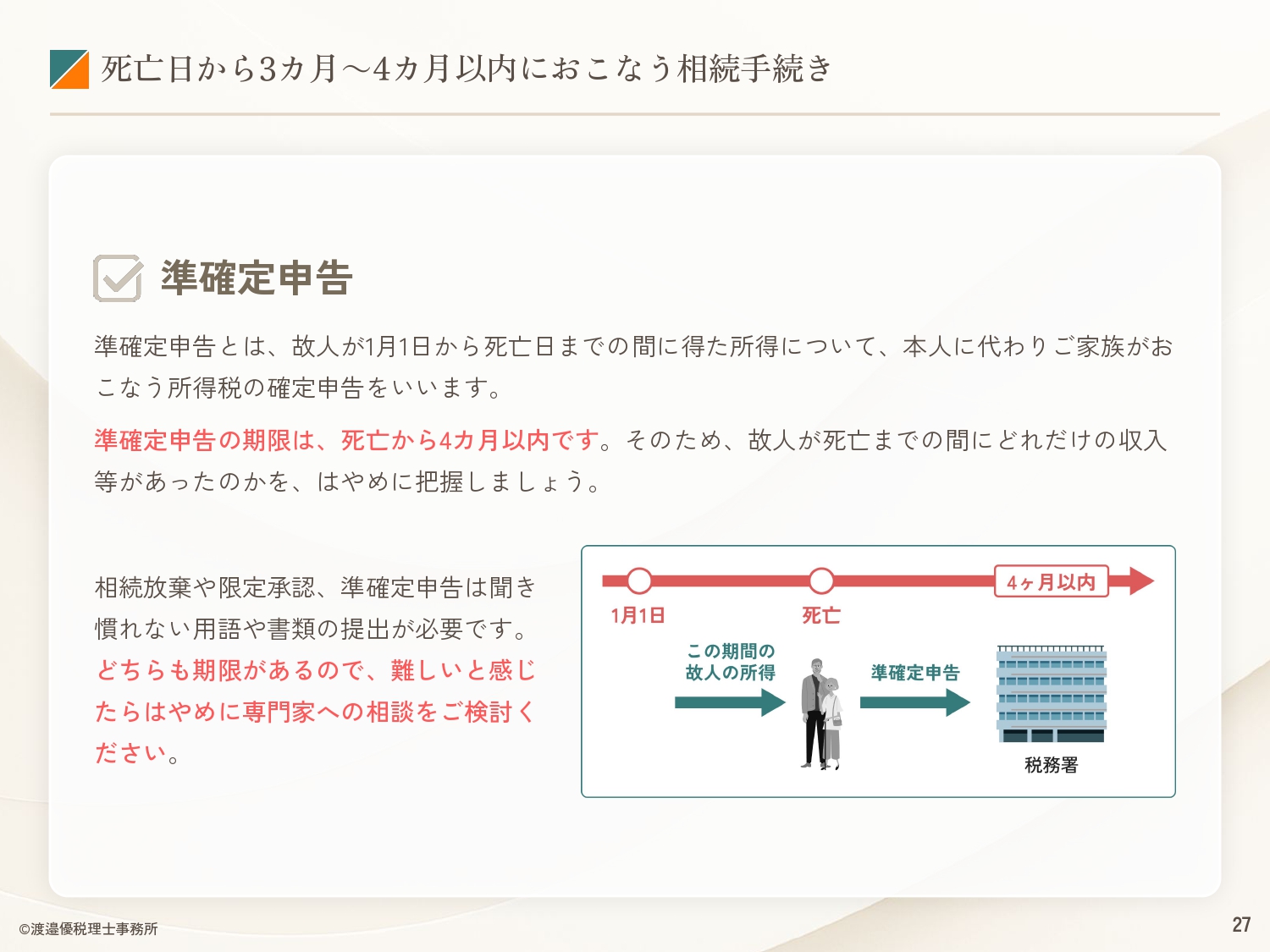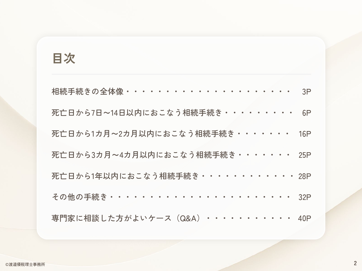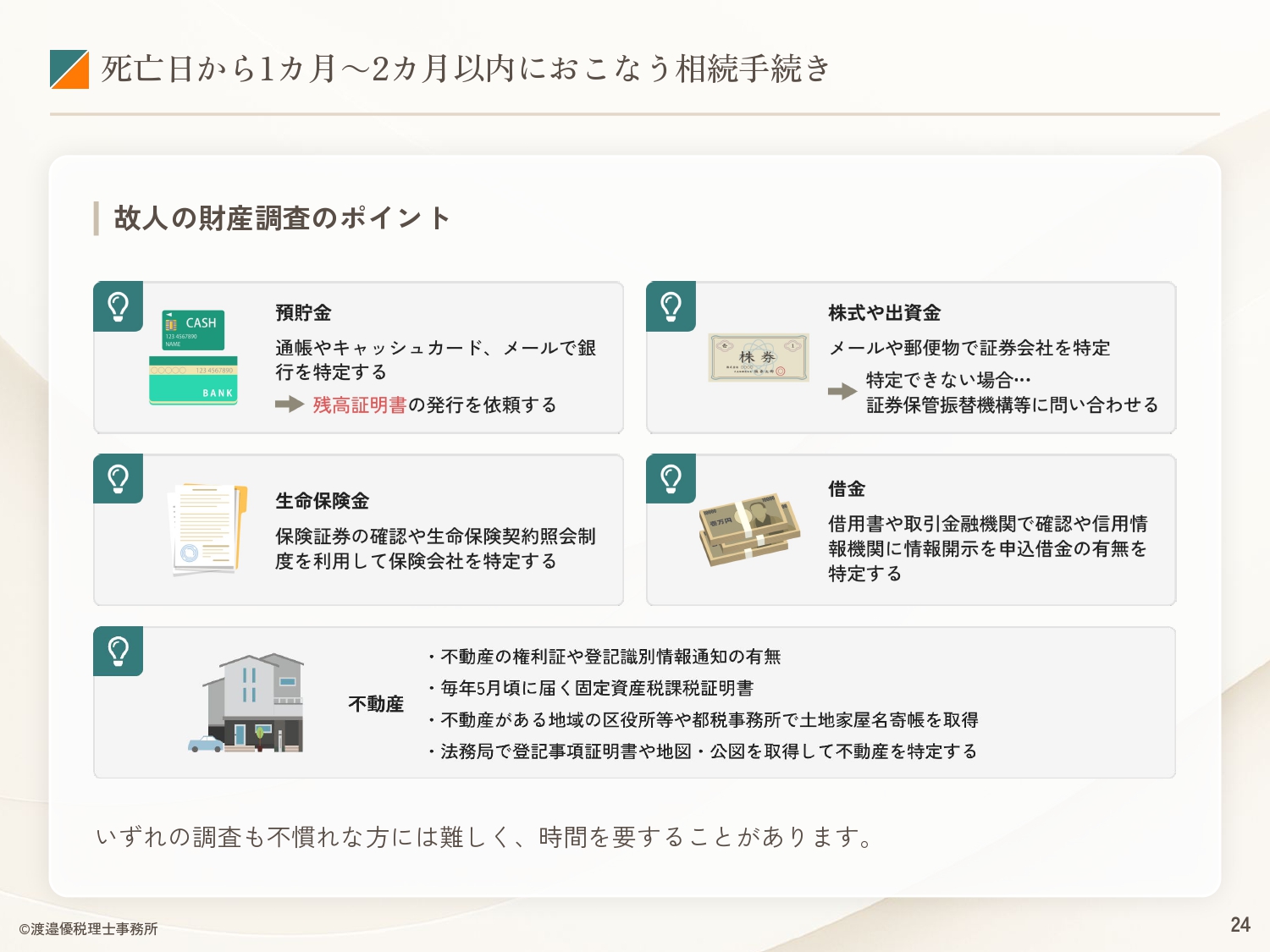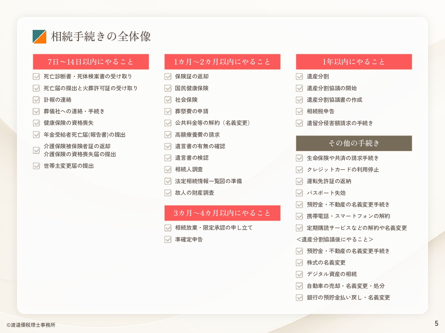 本資料では、相続手続きで「何をするか」「いつまでにやるか」「どこに行けばいいか」をまとめています。