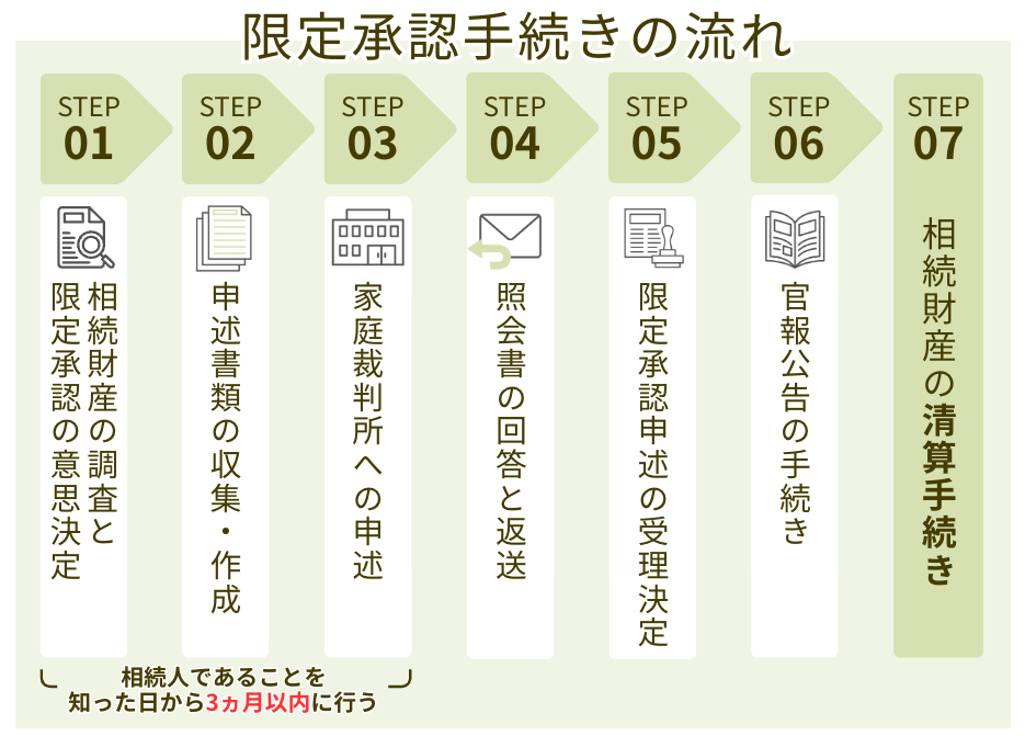 | 家庭裁判所への申述 | 相続放棄または限定承認を選択する場合、起算点から3ヵ月以内に家庭裁判所へ必要書類を提出して申述する。 |