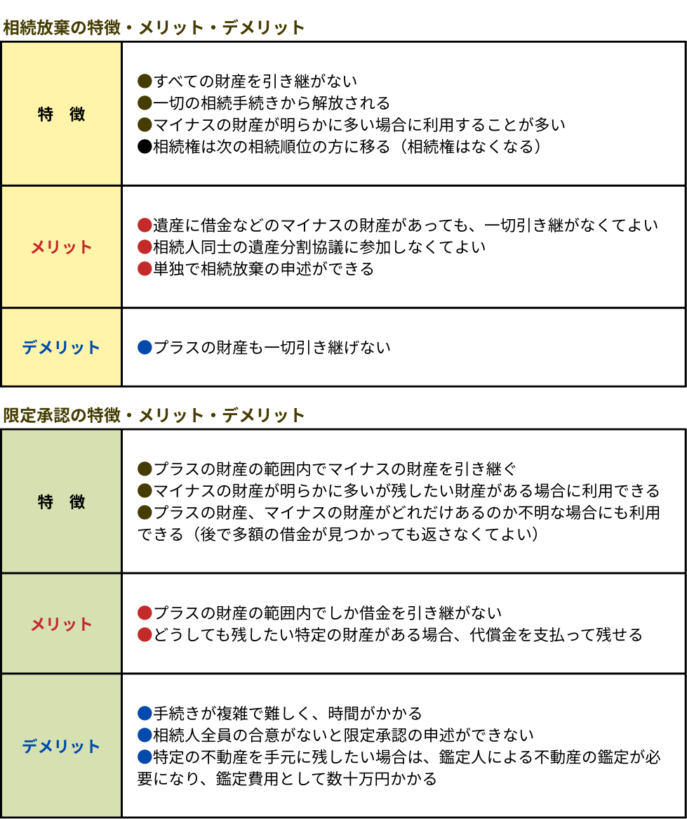 相続放棄と限定承認の特徴とメリット・デメリットは、次のとおりです。