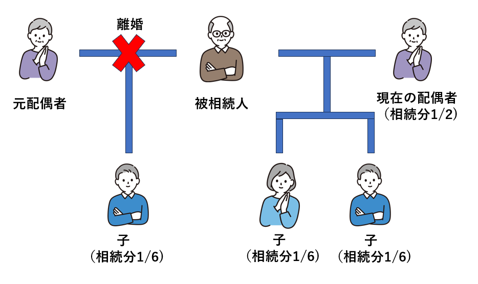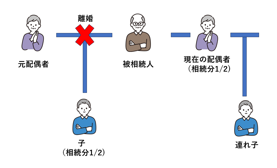 相続人は「現在の配偶者」と「元配偶者との子ども」のみとなり、法定相続分は現在の配偶者1/2、元配偶者との子ども1/2になります。