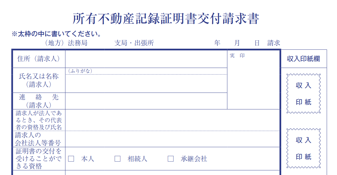上記の書類と共に法務省所定の「所有不動産記録証明書交付請求書」が必要になります。請求書は法務省のHPからダウンロード可能です。